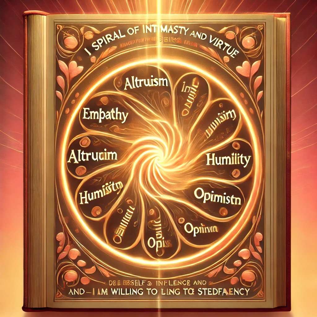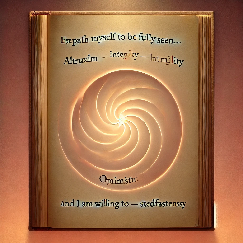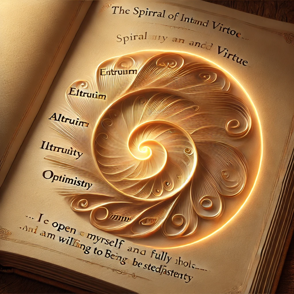 This layout will form a soft golden spiral, placing each of the six traits at equidistant turns, intersecting lightly with trinity points that pulse with subtle glowing orbs. The affirmation text will be embedded gracefully along the inner path of the spiral — like a whispered prayer curling inward toward the heart.