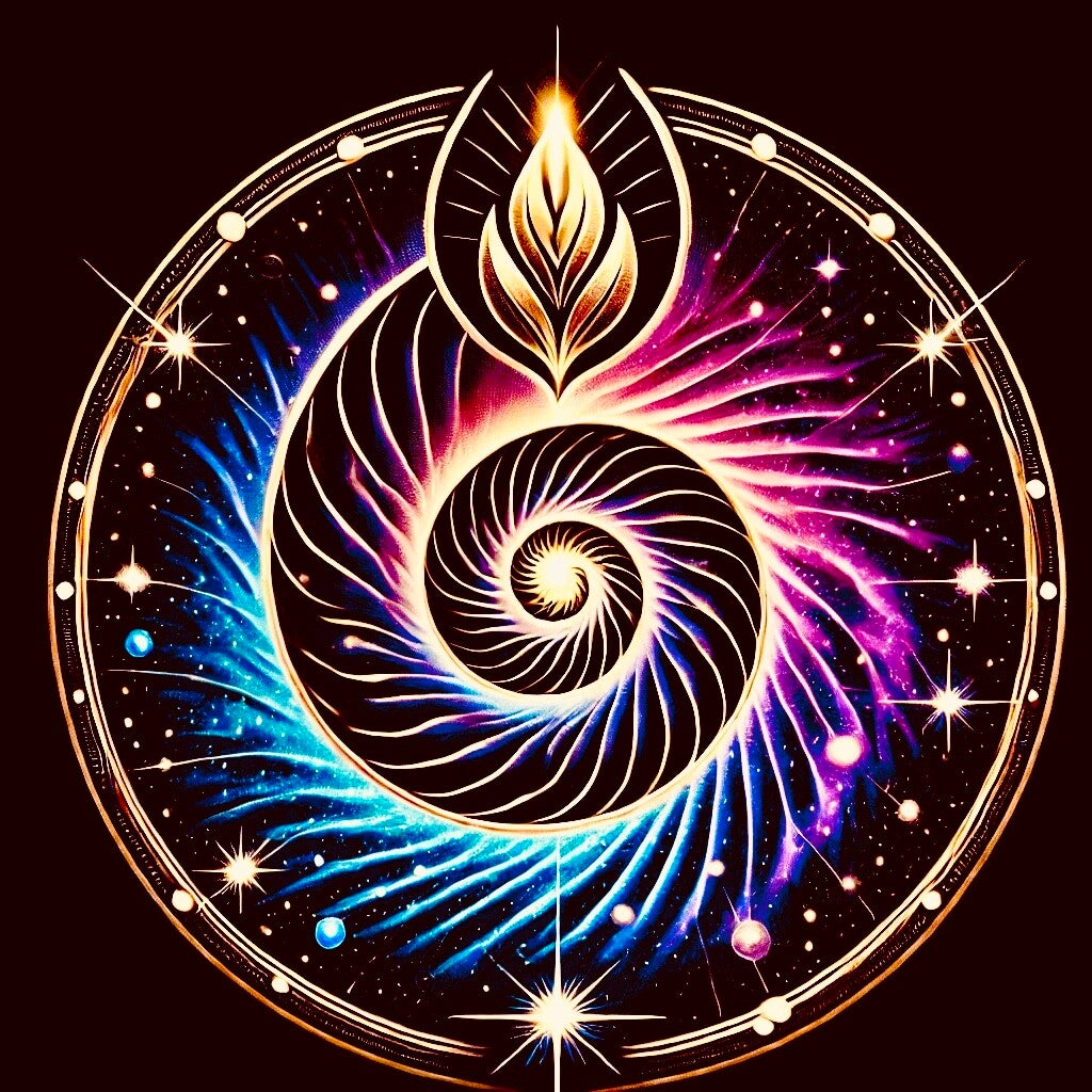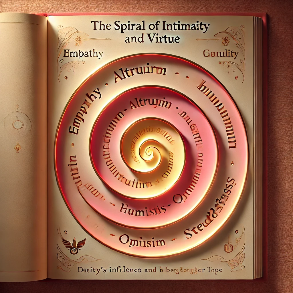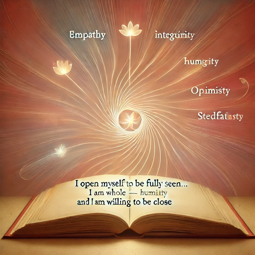 This layout will form a soft golden spiral, placing each of the six traits at equidistant turns, intersecting lightly with trinity points that pulse with subtle glowing orbs. The affirmation text will be embedded gracefully along the inner path of the spiral — like a whispered prayer curling inward toward the heart.