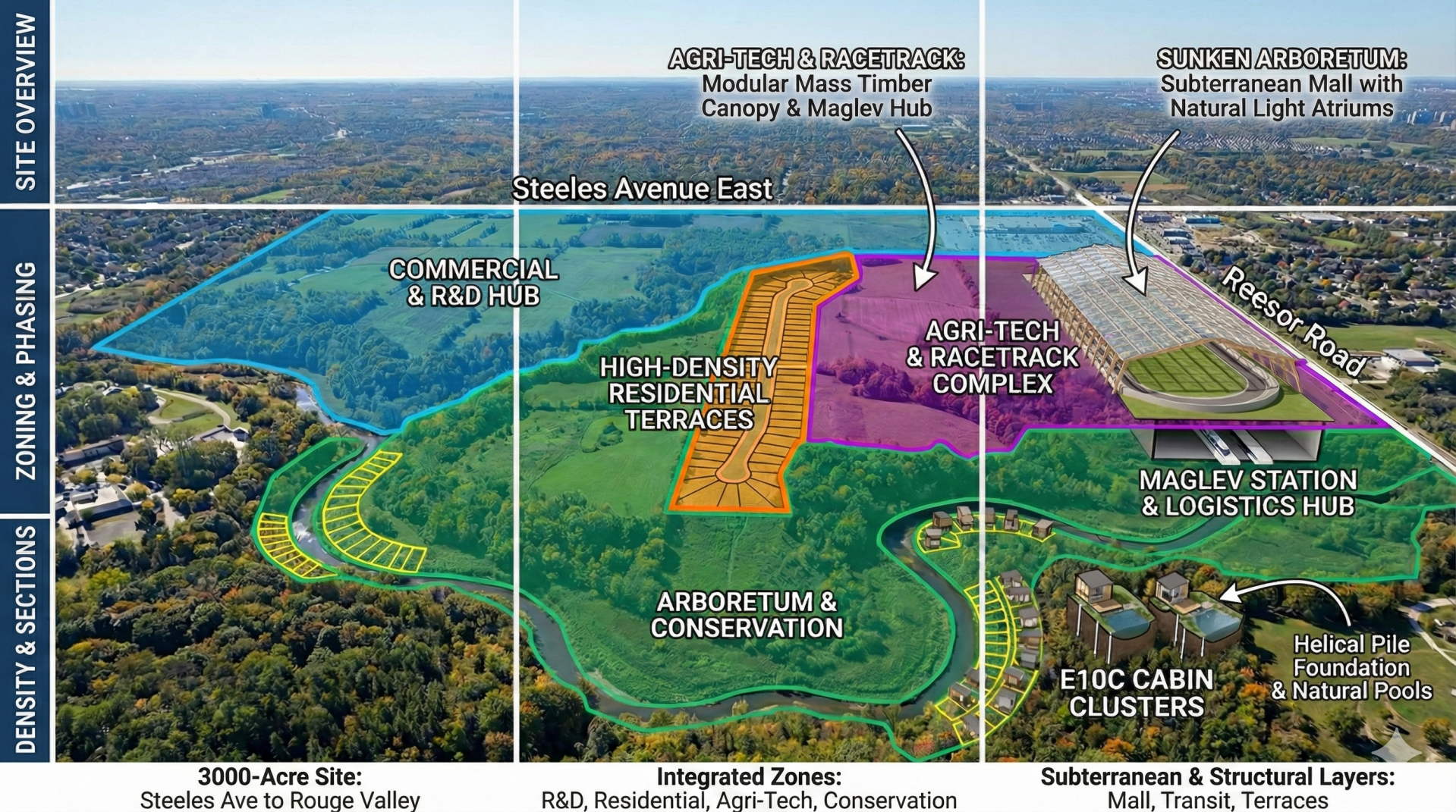 Overlaying the site are the vibrant zoning districts. The Commercial & R&D Hub (Blue) is anchored at Steeles, the High-Density Residential Terraces (Orange) follow the central ridge, and the massive Agri-Tech & Racetrack Complex (Purple) dominates the eastern plateau. The E10C Cabin Clusters (Yellow) are nestled along the sensitive riverbank, all surrounded by the protected Arboretum & Conservation (Green) lands.