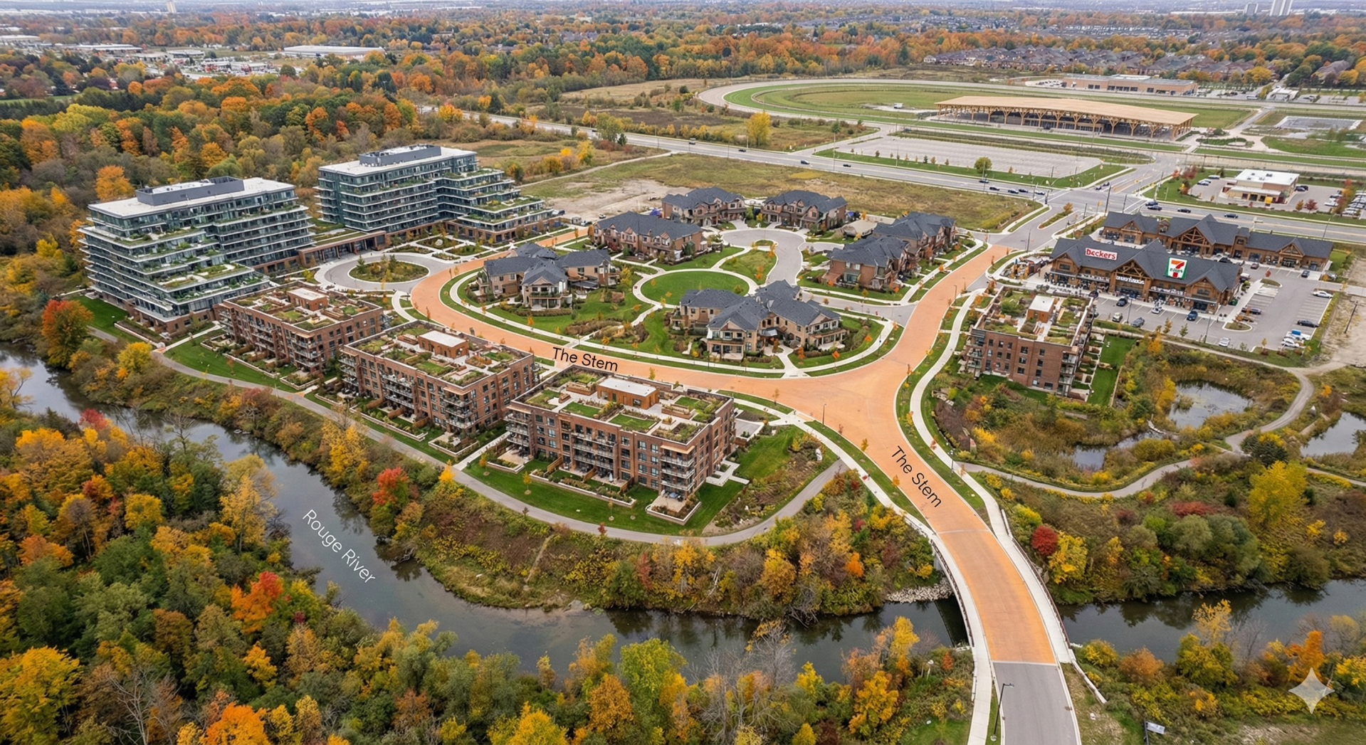 This oblique aerial shot establishes the massive scale and strategic location of the site, bordered by Steeles Avenue to the north, Reesor Road to the east, and the winding Rouge River valley to the south. It shows the existing context of agricultural land and the Walmart commercial hub. .