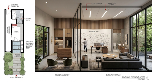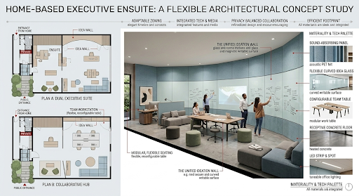 Instead of showcasing just one interior, this image presents a comprehensive design study. It features two distinct floor plan configurations (the "Dual Office/Huddle" setup and the "Fluid Workshop" setup) that maintain the 750 sq. ft. constraint and the dual-access requirement. The dashboard includes detailed conceptual drawings, materiality palettes, and an exploded volumetric diagram, illustrating how the space can adapt dynamically rather than being defined by a single static furniture arrangement.
