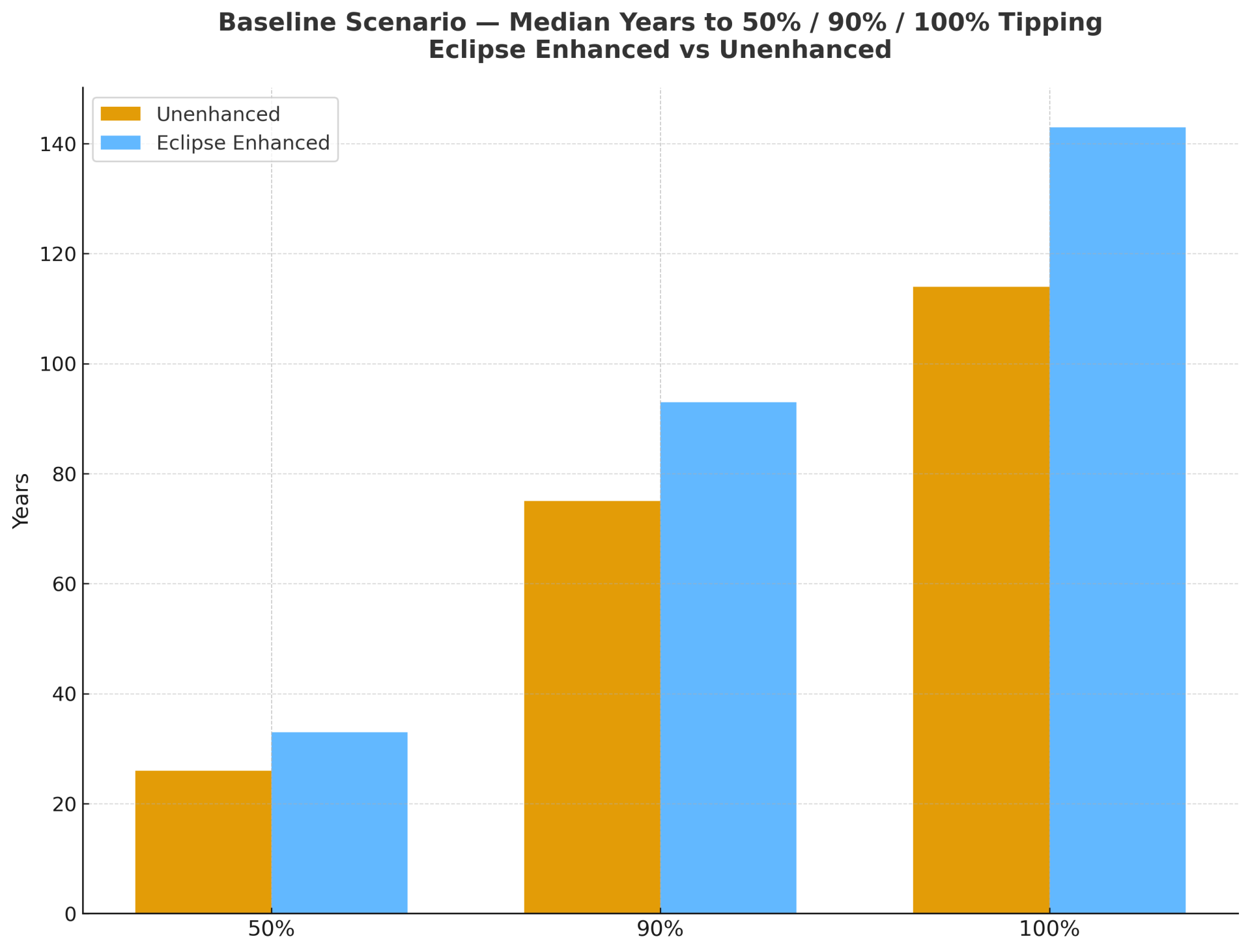 • t₅₀ (50% tip) moves from ~26 yrs → ~33 yrs (≈ +7 years).
